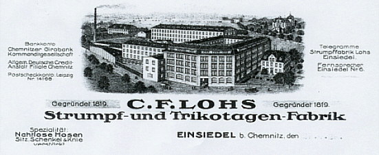 Die Firma C.F. Lohs wurde 1819 am 29. November in Einsiedel gegründet. Die Fabrik galt damals als einer der größten Arbeitgeber in Einsiedel. Sie wurde im Laufe der Jahre immer mehr ausgebaut und modernisiert. Zu Spitzenzeiten fanden 350 Menschen hier Arbeit. Am 06.02.1945 und 05.03.0945 wurde beim Angriff auf Chemnitz durch die amerikanische Luftwaffe auch Einsiedel bombardiert. Ca. 93 % des Ortes wurden zerstört, unter anderen auch die Strumpffabrik C.F. Lohs zu 99 % fast komplett. Nach dem Krieg wollten die Söhne von Christian Karl die Fabrik wieder aufbauen, die zaghaften Versuche mit wenigen Maschinen wurden aber bald durch die neuen Herren (Russen) behindert und unterbunden. Christian Karl Lohs wurde mehrmals inhaftiert und konnte nur unter Anstrengungen befreit werden. Nach seiner letzten Haft floh deshalb die ganze Familie 1950 in den Westen. Das Grundstück verkam, weil sich lange niemand darum kümmerte. Zu DDR Zeiten wurde dann an dieser Stelle ein Möbelkonsum gebaut. Erst lange nach der Wende wurde 1993 das Gebäude und das Gelände von den noch lebenden Erben des Christian Friedrich Lohs übernommen. Heute entsteht dort eine moderne Wohnanlage. Die älteste Strumpf- und Trikotagen- Fabrik aus Einsiedel stand an der Berbisdorfer Straße 24. 1819 gründet Carl-Friedrich Lohs(geb.10.12.1790) in Einsiedel eine Strumpf und Trikotagen Fabrik. Sie gilt als älteste Strumpffabrik in Einsiedel 1868 am 12. Mai starb Carl Friedrich Lohs 1868 nach dem Tod von Carl Friedrich Lohs übernimmt sein Sohn Christian Friedrich Lohs (geb. 9.7.1819) die Leitung der Firma 1884 stirb am 3. Januar Christian Friedrich Lohs, sein ältester Sohn Friedrich Linus Lohs (geb. 6.12.1848) wurde sein Nachfolger 1888 und 1896 wurden umfangreiche Erweiterungsbauten und Modernisierungen durchgeführt 1896 wurde ein neues großes Fabrikgebäude errichtet und mit modernen Maschinen ausgerichtet 1912 hatte die Fabrik etwa 350 Angestellte, ziemlich genau so viele waren Heimarbeiter 1914 bis 1918 erhielt die Firma C.F. Lohs Großaufträge vom Militär 1916 stirb Friedrich Linus Lohs links, sein Sohn Christian Carl Lohs, rechts (geb. 30.12.1887) leitet jetzt die Firma 1919 am 29.11. begeht die Firma Lohs ihr 100 jähriges Firmenjubiläum 1922 bis 1929 war Inflation und Weltwirtschaftskriese, das führte zu Kurzarbeit, Lohnkürzungen und Entlassungen, während dieser Zeit fanden auch erste Streiks statt 1933 wurde der Betrieb in die NS- Wehrwirtschaft eingebunden (bis 1945) es wurde wieder die Vollbeschäftigung eingeführt 1945 wurde am 4. Februar die traditionsreiche Fabrik C.F Lohs total zerstört (99%) 1947 wird in einem Gebäude die Produktion wieder aufgenommen 1950 flieht Christian Karl Lohs nach “Schwierigkeiten”, unter anderem mehrfach verhaftet, mit dem neuen System in den Westen danach Möbelkonsum, ein Landwarenkaufhaus der Konsumgenossenschaft, bestand bis zur Wende 1990, danach wurde das Gebäude dem Verfall preisgegeben. 2004 aus der traditionsreichen Firma wird eine moderne Wohnungsanlage.