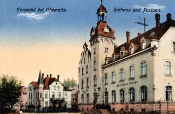 01.08.1856 erste königlich sächsische Postexpedition im ehemaligen Lehngericht am Plan, später bekannt als Apotheke. Der erster Postverwalter war Robert Siegel 1868 Verlegung der Post in das Grundstück Hauptstrasse 49. dieses Gebäude wurde am 5.3.45 durch Bomben total zerstört und danach abgerissen. 09.10.1875 Verlegung der Post in das Eisenbahn-Stationsgebäude wurde am 5.3.45 ebenfalls durch Bomben total zerstört 01.01.1878 Erneute Verlegung der Post nach Wiesenstraße 3 (ehemals Kurbad, dann BHG, später Freifläche am Plus-Markt, jetzt Getränkemarkt der Firma Getränkewelt) 16.07.1900 Die Einsiedler Post zieht in den linken Flügel des neuen Rathauses als Kaiserliches Postamt, dann Deutsche Reichspost 01.04.1931 Hat die Post ein eigenes Gebäude Hauptstrasse 66 erworben und zum modernen Postamt ausgebaut. Dieses Gebäude wurde am 5.3.45 durch Bomben total zerstört. März 1945 behelfsmäßig wird in der Veranda vom Gasthof “Drei Eichen” der Postbetrieb wieder aufgenommen 1946 wurde im Postgrundstück Hauptstraße 66 eine Baracke aufgestellt und der Post- betrieb von dort aus abgewickelt. 1954 wird das noch heute bestehende, aber nicht mehr betriebene, neue Postgebäude am alten Standort seiner Bestimmung übergeben. 1993-1994 errichtet die deutsche Telekom im oberen Ortsteil an der Einsiedler Hauptstraße ein neues Fernsprechgebäude. Zum ersten mal können alle beantragten Telefonanschlüsse realisiert werden. 1995 erfolgte eine grundlegende Sanierung des Gebäudes 31.05.1998 wird das Einsiedler Postamt für immer geschlossen, den Postbetrieb übernehmen jetzt sogenannte Postagenturen 01.06.1998 eröffnet die erste Postagentur in Einsiedel im Zeitschriftenshop Einsiedel Am Plan 6 01.12.2000 nachdem am 30.11. die Postagentur am Plan geschlossen wurde, übernimmt die Postagentur der Quelleshop Einsiedel an der Einsiedler Hauptstraße 83 2004 im Januar ist es endgültig vorbei mit dem Postgebäude in Einsiedel. Eine private Sicherheitsfirma nutzt das Gebäude jetzt als Bürokomplex 01.04.2002 wird bei der Firma Fröhlich Elektronik eine Verkaufsstelle des privaten Briefdienstes WVD eingerichtet und ein Briefkasten der so genannten “grünen Post” angebracht. 03.07.2006 Seit diesem Monat treten die beiden privaten Briefdienste Media Logistig Dresden und WVD Postservice Partner Chemnitz unter der einheitlichen Marke PostModern auf. Beide Firmen bleiben selbständig, werden aber unter dem neuen gemeinsamen Markendach ihre Dienstleistungen und den Auftritt beim Kunden vereinheitlichen. 2008 am 30.09. stellt der private Briefdienstleister WVD seinen Betrieb ein. Am selben Tag wurde der sogenannte “Grüne Briefkasten” abgeschraubt. Mit der Schließung des Betriebes haben ca. 500 Mitarbeiter ihren Arbeitsplatz verloren. Seit dem 1.10. ist als neuer privater Postdienstleister im Freistaat Sachsen die City-Post zuständig. 01.10.2008 in Einsiedel können bei der Firma Fröhlich Elektronik die Leistungen der City-Post in Anspruch genommen werden. Auch die Leistungen des Paketdienstleister GLS werden hier angeboten. 29.11.2008 die Postagentur Evelin Hofmann in der Quelle Agentur wird geschlossen. 1.12.2008 im Modehaus Einsiedel wird der Postbetrieb fortgesetzt