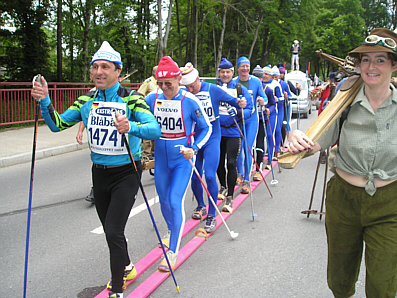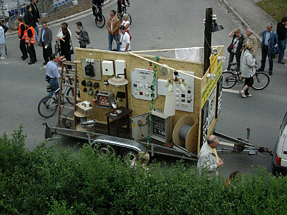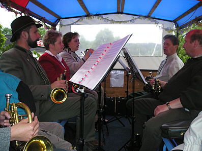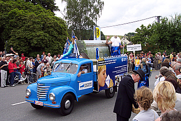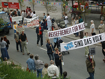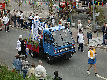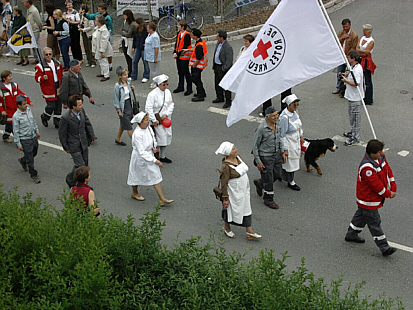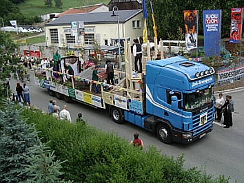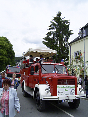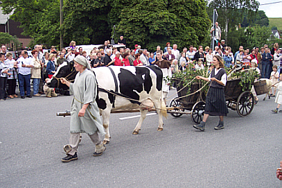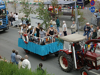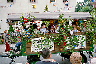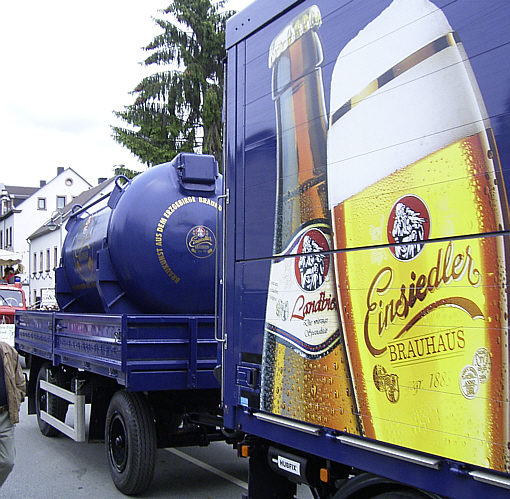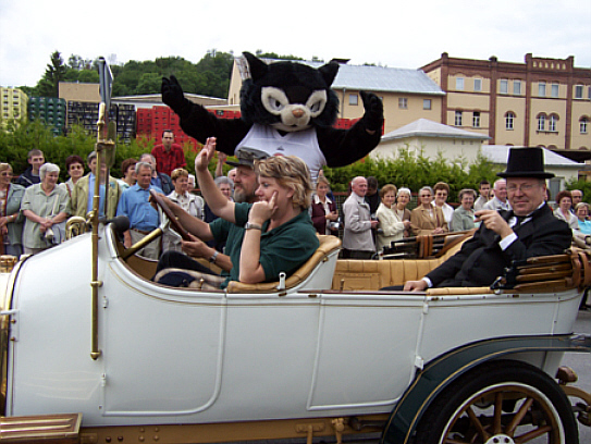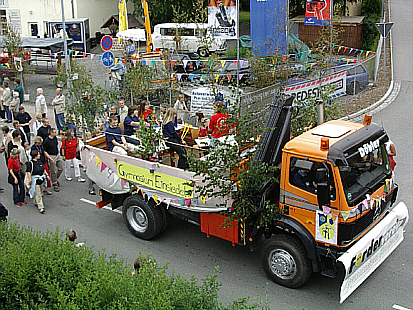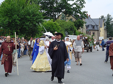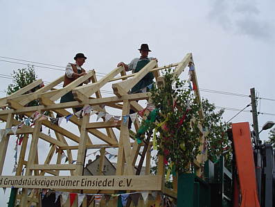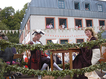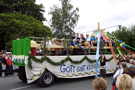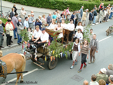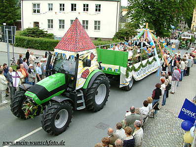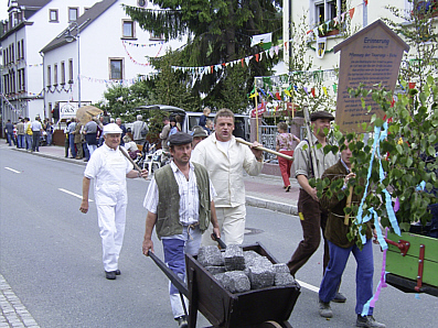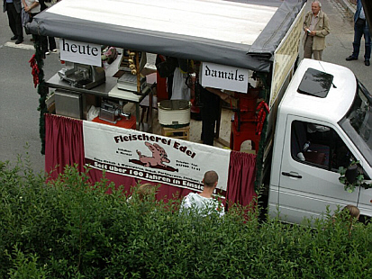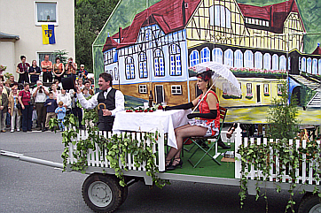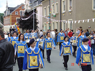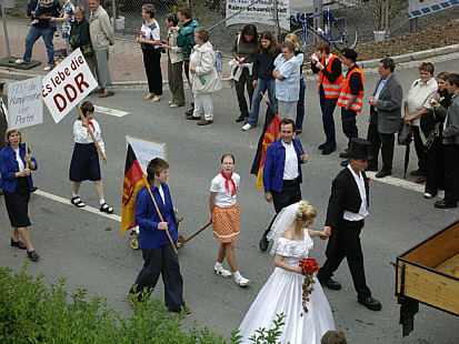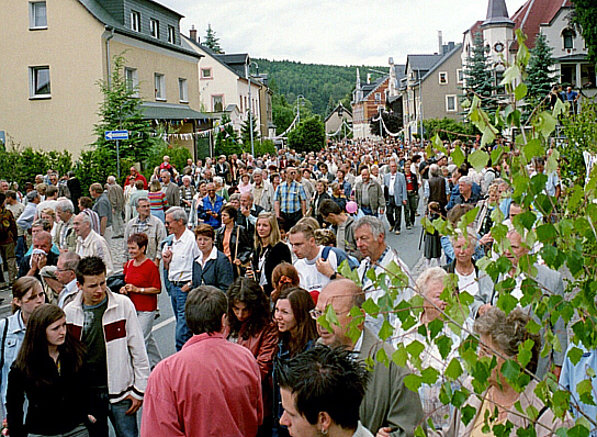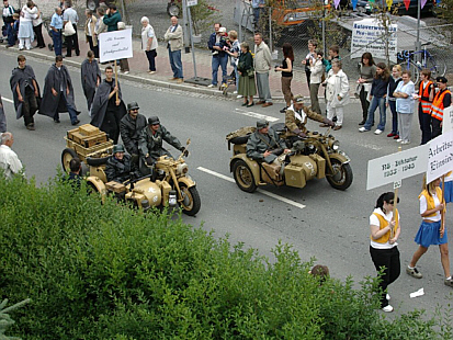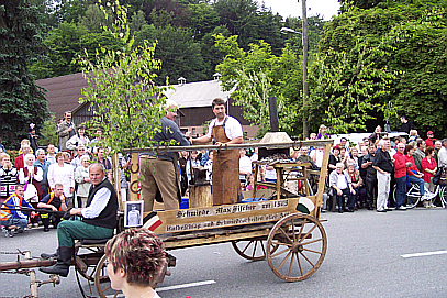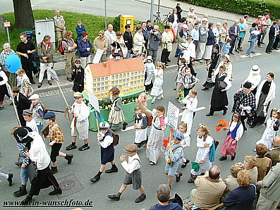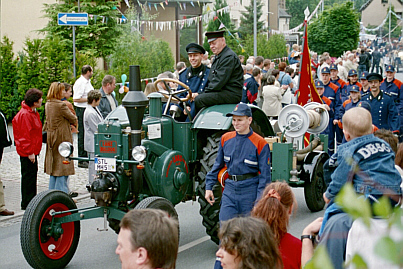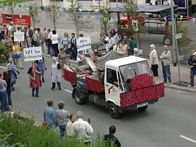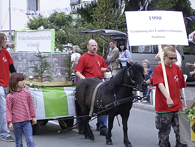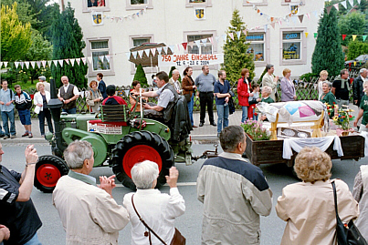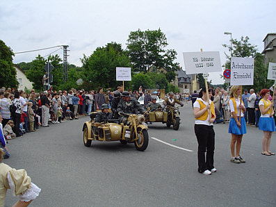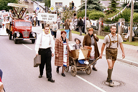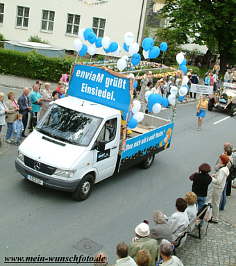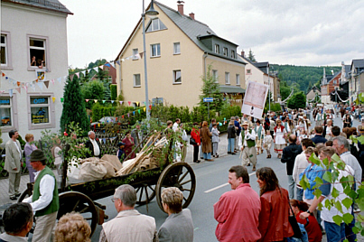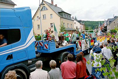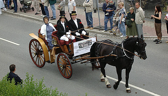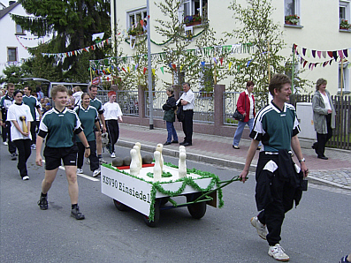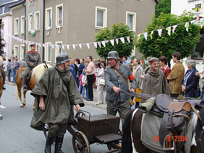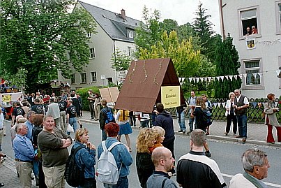 Angeführt wurde der Festumzug von einer Reiterstaffel, dem Spielmannszug “Chemnitztaler”, gefolgt vom Alten Einsiedler und den Herold. Bild 1 Urkunde vom Papst Innocenz IV - 1254 Die ersten Ansiedler kamen in das Zwönitztal und unseren Heimatort Einsiedel vermutlich bereits im 12. Jahrhundert. In der päpstlichen Urkunde von 1254 wird erstmalig der Kirchenbezirk Chemnitz genannt und dem Abt des Benediktinerklosters Chemnitz auf dem Schlossberg ein Aufsichtsrecht für den Pfarrer der St. Jakobi-Kirche Chemnitz und die umliegenden Kirchen gewährt. Zu den umliegenden Kirchen gehörte auch die in Einsiedel. Wir feiern die 750-Jahr-Feier, weil bereits die 700- und 725-Jahr-Feier auf dieser Grundlage stattfanden. Die eigentliche Ersterwähnung von EinsiedeI, also die älteste Urkunde, in der der Name Einsiedel auftaucht, stammt aus dem Jahr 1299. Dort wird ein Guntherus de Einsidelen als Burgmann in Zschopau genannt. Das Bild zeigt die ersten Siedler, die im 13. Jahrhundert hier nach Einsiedel kamen. Es waren deutsche Auswanderer aus Süddeutschland, die den Wald rodeten und sich eine neue Existenz schufen. Dargestellt von den Mitgliedern des “Spießgeselle e.V.”. Bild 2 Bauernkrieg und Reformation 1525 In der Zeit des ausgehenden Mittelalters waren die Frondienste und Lebensbedingungen recht hart. Die in vielen Burgen etablierten Adligen forderten zahllose Arbeitsleistungen zur Bestellung ihrer Felder und zur Versorgung des Viehs. Mit der Bibelübersetzung in die deutsche Sprache durch Martin Luther und der Predigt in deutscher Sprache waren wichtige Voraussetzungen für die Entstehung einer evangelischen, vom Papst unabhängigen Kirche geschaffen worden. Alle Bauernkriegsforderungen wurden mit Bibelzitaten begründet und belegt. In Einsiedel sind Bauernaufstände nicht bekannt, der Amtmann in Wolkenstein berichtete dem Kurfürst, "die Bauern raseten ein wenig", es gab also Unmut und es gab Verhandlungen über die Begrenzung der Fronarbeit und der Wildschäden. Es werden typische Waffen des Bauernkrieges mit stehender Sense und Dreschflegel gezeigt. Der erste evangelische Pfarrer ]ohann Marschner ist 1547 in Einsiedel bezeugt. Dargestellt von den Mitgliedern des “Spießgeselle e.V.”. Bild 3 Verträge zwischen Bauern und Adel 1796 Die wirtschaftliche und gesellschaftliche Entwicklung am Ende des 18. Jhd. ermöglichte den Abschluss von Verträgen zwischen dem Gerichtsherrn Kurt Heinrich von Einsiedel, der von den Rittergütern Dittersdorf und Weißbach aus die Herrschaft Einsiedel verwaltete und den Bauern aus allen zur Herrschaft gehörenden Orten nämlich Reichenhain, Erfenschlag, Einsiedei, Dittersdorf, Weißbach und Kemtau. Die Frondienste wurden eingeschränkt und eine Reihe von Geldleistungen dafür eingeführt. Mit diesen Änderungen entstanden Bedingungen für die freie wirtschaftliche Betätigung und den Übergang zu den Industrieentwicklungen im 19.Jh. Das Bild zeigt den Abschluss der Verträge mit Siegel und Unterschrift zwischen Bauern und Adel. Dargestellt von den Mitgliedern des “Spießgeselle e.V.”. Bild 4 Kirchenbau 1822 - 1827 Wir sehen ein Modell der Einsiedler Kirche, wie sie in den Jahren 1822 - 1827 nach den Plänen und unter der Leitung von Christian Friedrich Uhlig aus Altenhain erbaut worden ist. Zunächst gab es Pläne, Teile der damals vielleicht schon 600 Jahre alten, inzwischen baufällig gewordenen Kirche wieder zu verwenden. Schließlich setzte sich der Entwurf zu einem kompletten Neubau durch. Toskanische Säulen, klassizistische Dreieckgiebel und eine barocke Haube auf dem quadratischen Turm bestimmen das Bild dieser Kirche, die 1945 zerstört und später verändert wieder aufgebaut wurde. Das Kirchenmodell begleiten im Festzug: Der Baumeister Uhlig, die Gräfin Renate Auguste Luise Henriette von Düben, die die Grundsteinlegung der Kirche vornahm, je ein Zimmermann, Maurer und Dachdecker, der Orgelbauer Johann Gotthold Jehmlich, der die von seinem Bruder begonnene Orgel vollendete, der damalige Ortspfarrer und Chronist des Baus, Johann Friedrich Benjamin Fritsche, der Kirchenrechnungsführer, Fuhrdienste leistende Bauern und ein Schullehrer. Bild 5 Straßenbau 1847 Das 19. Jahrhundert ist in unserer Heimat durch die Entwicklung von Gewerbe und Industrie gekennzeichnet. Die zunehmende Warenproduktion erforderte ausgebaute Straßen mit Brücken über die Bäche und Flüsse, so dass eine weitgehende sichere Befahrbarkeit täglich gewährleistet werden konnte. Die Jahrhunderte zuvor gab es wenig ausgebaute Pfade mit Furten durch die Flüsse. Nach langen Regenzeiten konnten die aufgeweichten Wege nicht befahren und die Hochwasser führenden Flüsse nicht gequert werden. Der erste Straßenbau durch Einsiedel war der Bau einer befestigten Verbindung zwischen Alt-Chemnitz und Ehrenfriedersdorf. Die Straße wurde als Halbchaussee ausgebaut, das ist eine Straße der 2. Ausbaustufe. Das Bild zeigt Bauarbeiter in historischer Kleidung mit historischen Geräten und großen Pflastersteinen. Der Straßenbau wurde damals weitgehend durch menschliche Arbeitskraft bewältigt. Größere Steine konnten mit Pferdefuhrwerken auf die künftige Trasse gefahren werden und wurden vor Ort durch so genannte Steinbrecher zertrümmert und als Packlager verwandt. Der Arbeitsaufwand war riesenhaft. Die Straße wurde deshalb von der gräflichen Herrschaft angeregt als eine Arbeitsbeschaffungsmaßnahme, in Notzeit ausgebaut. Davon kündet die Gedenktafel an der Teuerungseiche noch heute. Bild 6 Eisenbahn seit 1875 11875 erhielt Einsiedel durch den Bau der Strecke Chemnitz - Aue - Adorf /V einen Eisenbahnanschluss. Die Beschäftigten der Eisenbahn trugen eine Uniform. Sie waren in der Mehrzahl Beamte der Königlich Sächsischen Staatseisenbahn. Von 1935 bis 1985 bot die Deutsche Reichsbahn, auch als Attraktion, das auf der Straße fahrbare Anschlussgleis an. Eisenbahnwagen wurden auf den Rollenfahrzeugen transportiert. Es wird ein Kesselwagen auf dem Straßenroller der Bauart C